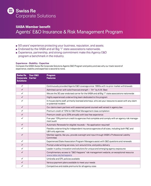 IIARI’s E&O program—underwritten by Westport Insurance Corporation, a member of Swiss Re Corporate Solutions—was developed by agents for agents, and is tailored to provide the broadest protection available. Program highlights include: